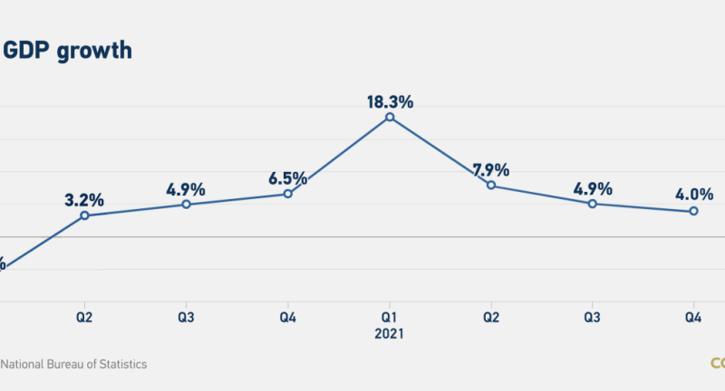 From October to December, the country's economy grew by 4 percent from a year earlier, a further deceleration from the 18.3 percent jump in the first quarter, according to NBS.
