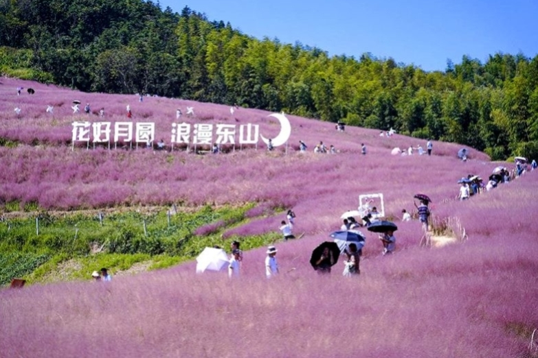 Photo taken on Sept. 26, 2021 shows tourists taking photos in a sea of pink flowers in Dongshan village, Tangxi township, Ningbo city, east China’s Zhejiang province. (Photo by Zheng Kaixia/People’s Daily Online)