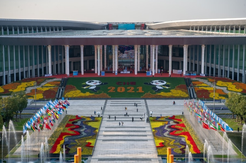 Photo taken on Nov. 9, 2021, shows a view of the south square of the National Exhibition and Convention Center (Shanghai), the main venue for the 4th China International Import Expo (CIIE), in east China's Shanghai. (Photo/Xinhua)