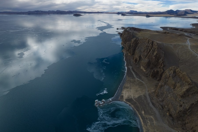 Aerial photo taken on Jan. 18, 2022, shows the scenery of Lake Namtso in southwest China's Tibet Autonomous Region.