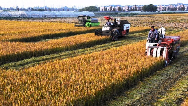 File photo was taken on Nov. 22, 2019, shows farmers harvesting rice in Yiting Town of Yiwu City, east China's Zhejiang Province.