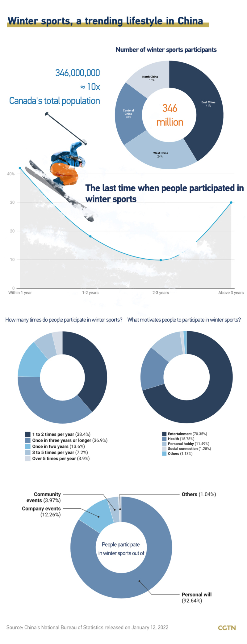 The 2022 Beijing Winter Olympics opens in ten days. Over 346 million Chinese people have participated in winter sports since 2015 when Beijing successfully won the bid to host the 2022 Winter Olympics together with co-host city Zhangjiakou, according to a survey released on January 12.