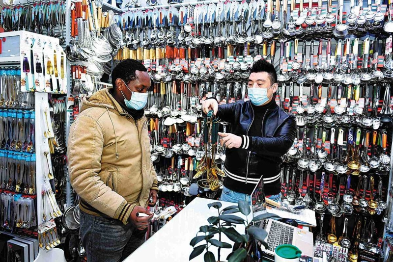 A Kenyan trader (left) purchases kitchenware at the Yiwu International Trade Market in Zhejiang province on Jan 14. (Photo/Xinhua)