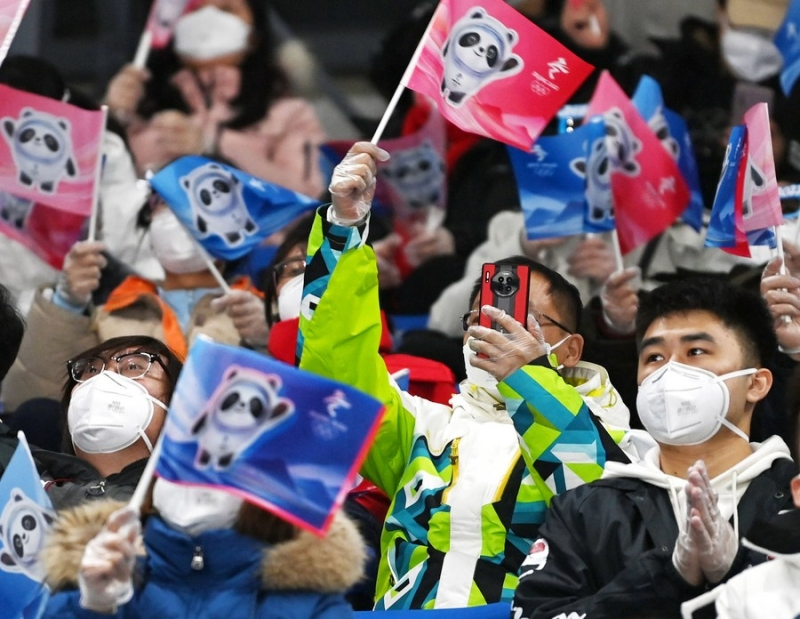 The audience react during the women's ice hockey preliminary round Group A match between Canada and Switzerland at National Indoor Stadium in Beijing, China, Feb. 3, 2022. (Xinhua/Li Ziheng)