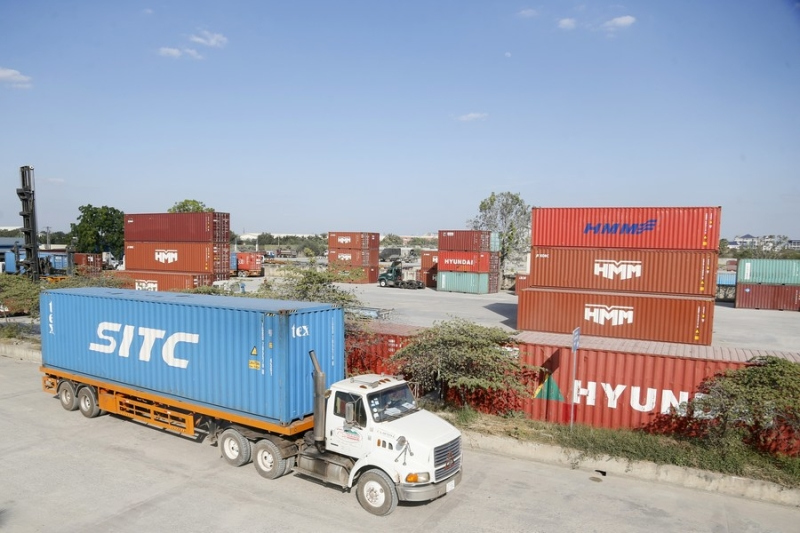A lorry drives out of the Hong Leng Huor Dry Port on the western suburb of Phnom Penh, Cambodia on Jan. 13, 2022. (Photo by Phearum/Xinhua)