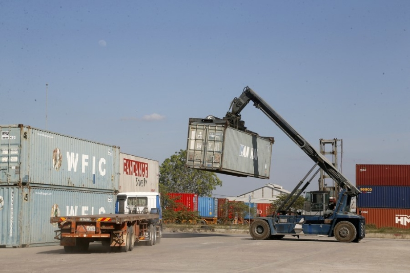 A crane truck lifts a container at the Hong Leng Huor Dry Port on the western suburb of Phnom Penh, Cambodia on Jan. 13, 2022. (Photo by Phearum/Xinhua)