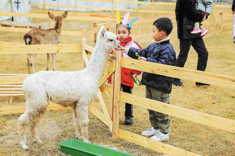 Children feed an alpaca at Yimadangxian's shared farm in Chengyang village, Zhejiang province, in January. (Photo/China Daily)