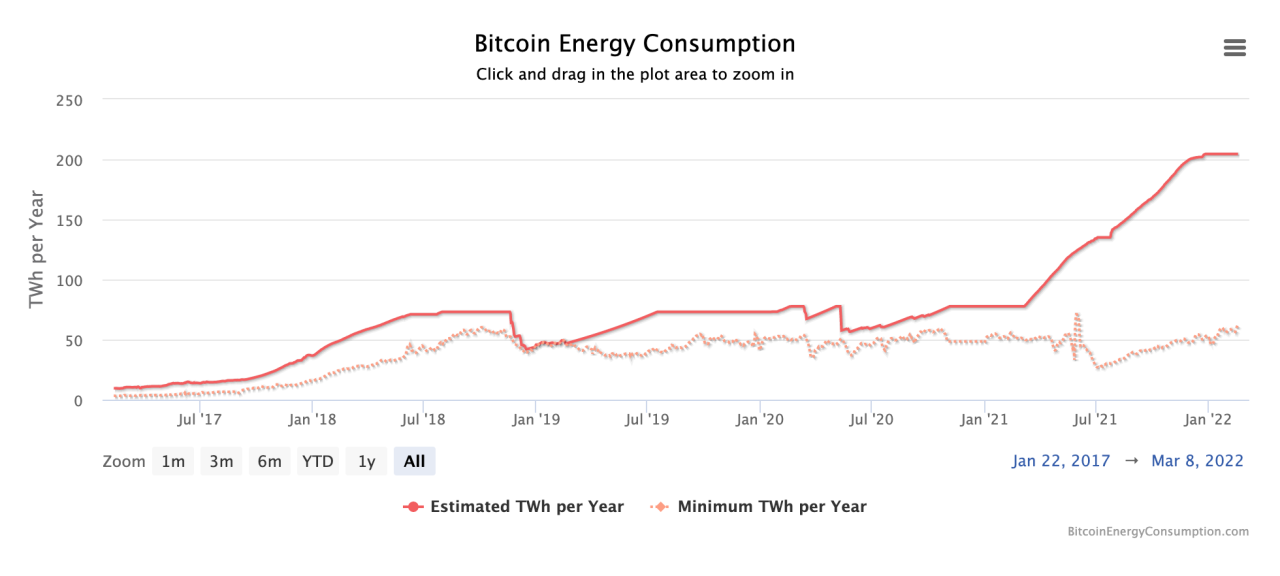 The Cambridge Bitcoin Electricity Consumption Index shows that Bitcoin, the most widely-mined cryptocurrency network, uses 122.87 Terawatt-hours of electricity every year—more than the Netherlands, Argentina, or the United Arab Emirates. Another analytics firm Digiconomist indicates that Bitcoin mining generates about 96 million tons of carbon dioxide emissions each year, which is equal to the amounts generated by some smaller countries.