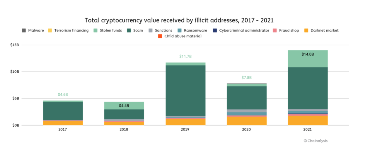 Cryptocurrency analytics website Chainalysis indicates that cryptocurrency-based crime hit a new all-time high in 2021, with illicit addresses receiving $14 billion over the course of the year, up from $7.8 billion in 2020.