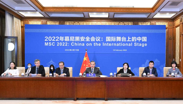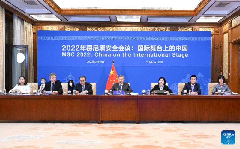 Chinese State Councilor and Foreign Minister Wang Yi delivers a keynote speech at the 58th Munich Security Conference (MSC) via video link in Beijing, capital of China, Feb. 19, 2022. (Photo by Shen Hong/Xinhua)