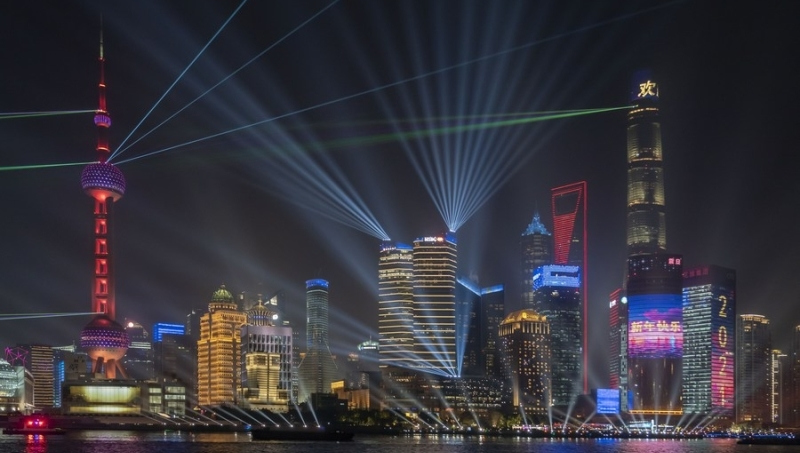 Photo taken on Jan. 2, 2021 shows the light show at the Lujiazui area in east China's Shanghai. (Photo by Wang Xiang/Xinhua)