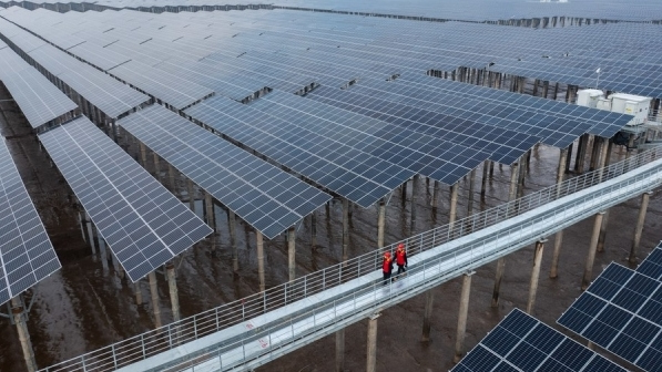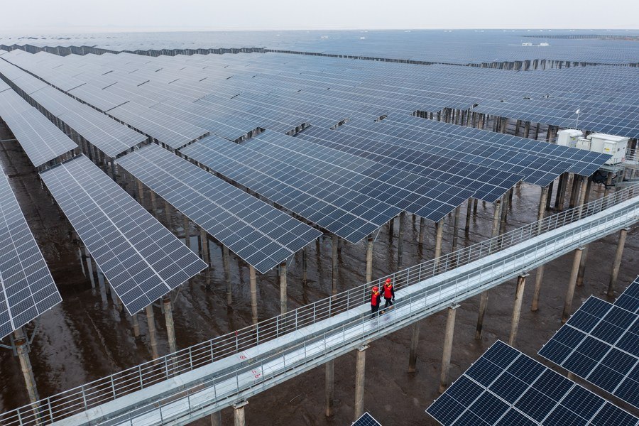 Aerial photo taken on Dec. 29, 2021 shows a photovoltaic power base in Xiangshan County, Ningbo City of east China's Zhejiang Province (Xinhua/Xu Yu)