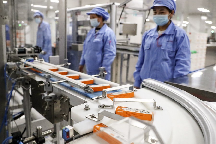 Staff members supervise the operation of an automated packing line for inactivated COVID-19 vaccine at Sinovac Life Sciences Co., Ltd. in Beijing, capital of China, on Jan. 6, 2021. (Xinhua/Lu Ye)
