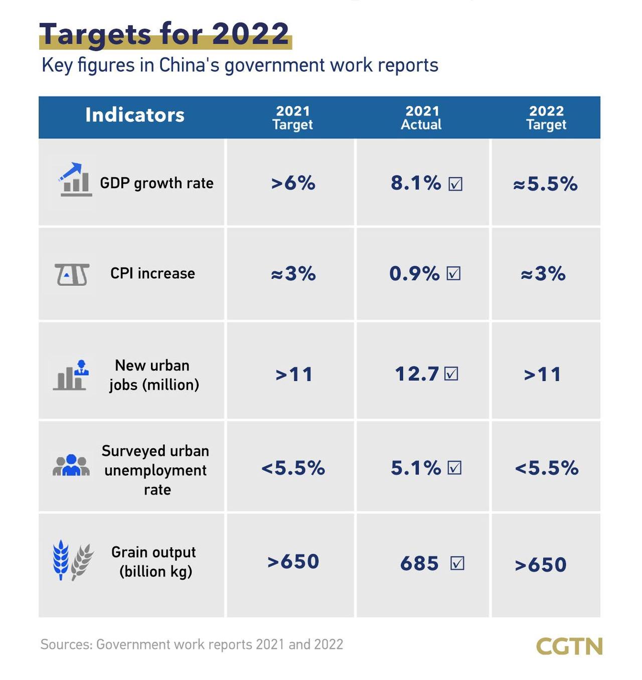 The world's second-largest economy set the gross domestic product (GDP) growth target at around 5.5 percent in 2022, according to the much-anticipated government work report delivered by Premier Li Keqiang on Saturday.