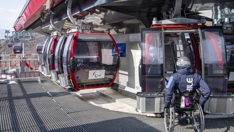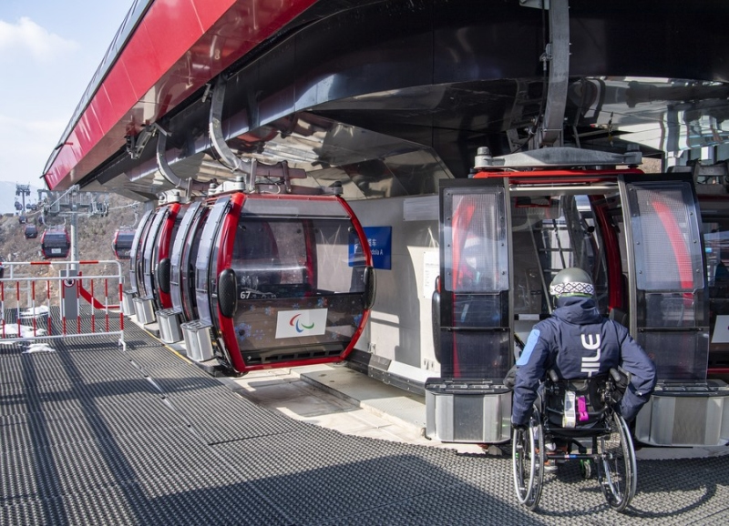 An athlete prepares to ride a cable car at China's National Alpine Skiing Center in Yanqing District, Beijing, capital of China, Feb. 28, 2022. (Photo by Sun Fei/Xinhua)