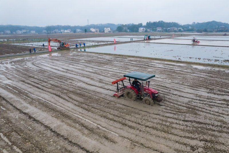 Aerial photo taken on Feb. 17, 2022 shows an agricultural vehicle leveling farmland in fields in Daping Village of Taoyuan County, central China's Hunan Province. (Photo by Chen Sihan/Xinhua)