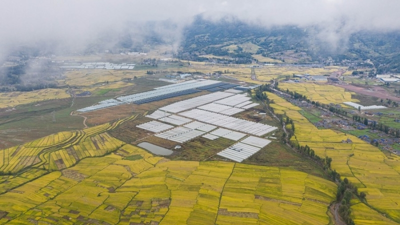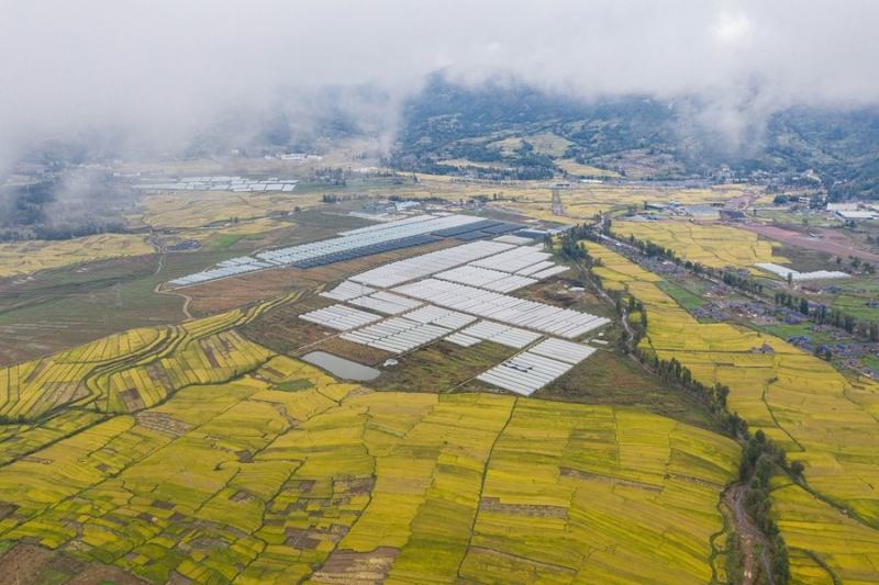 Aerial photo taken on Oct. 13, 2020 shows the farmland and agricultural industry park at Abingluogu Town in Zhaojue County, Liangshan Yi Autonomous Prefecture, southwest China's Sichuan Province. (Photo by Zhang Xiaoyu/Xinhua)