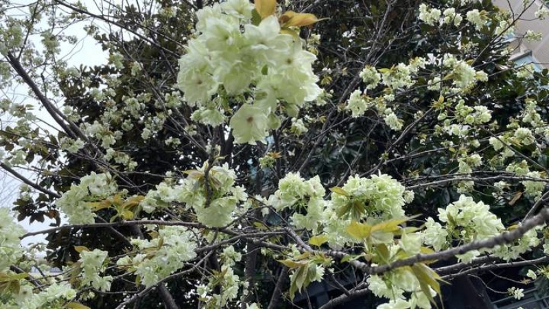 What makes this cherry tree so special? Different from the pink and white colors commonly seen in cherry blossom, its flowers are pale green. Before that, there is only one green cherry blossom tree beside the bank of the scenic spot Three Pools Mirroring the Moon in the West Lake.