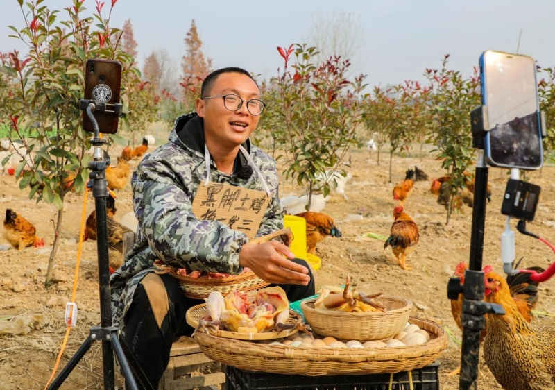 A live streamer with a trade company in Zongyang county, Tongling city, east China’s Anhui province, helps sell free-range chickens online, Dec. 7, 2021. (Photo by Zhou Feng/People’s Daily Online)
