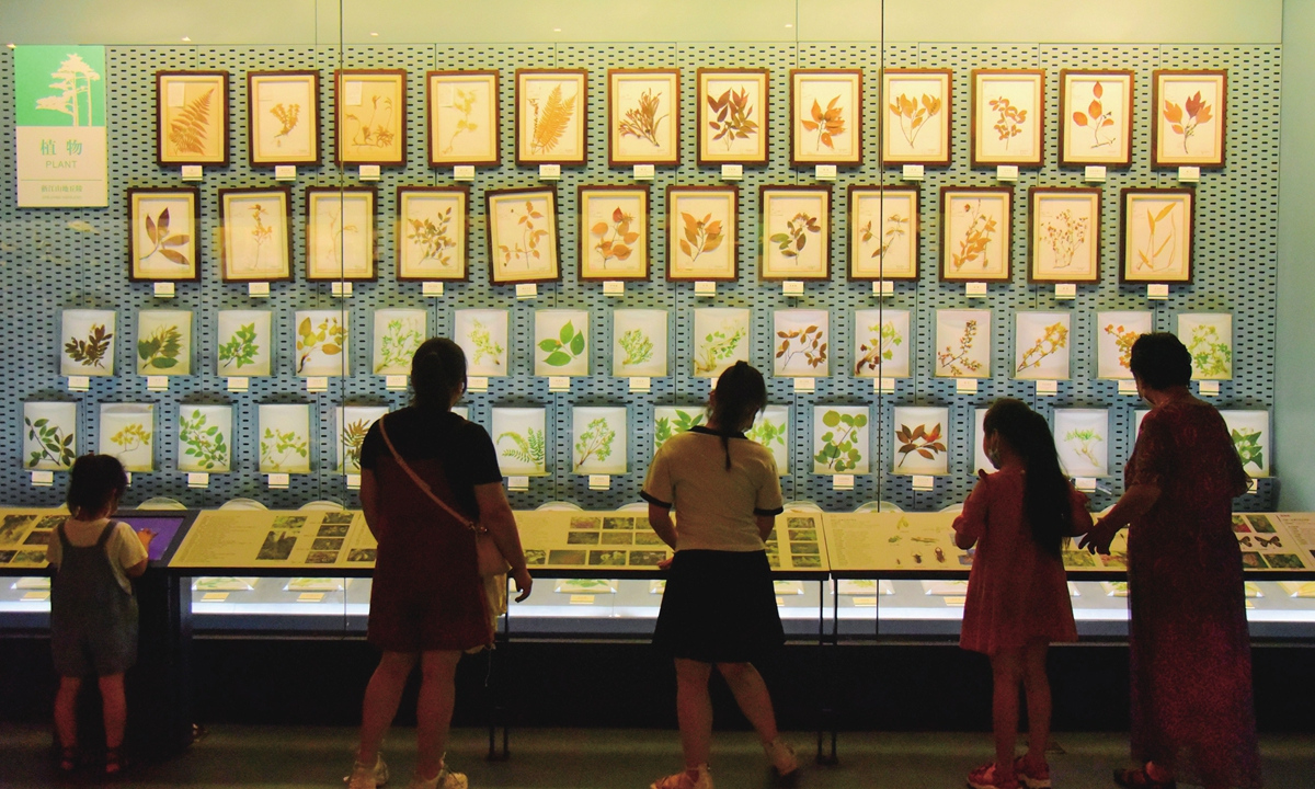 Parents and children look at a night exhibition of plants at the Zhejiang Museum of Natural History on July 6, 2022. (Photo/VCG)