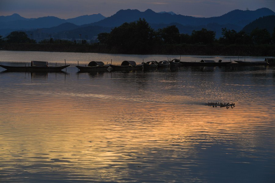 Photo taken on July 3, 2022 shows the scenery at dusk in Sandu Fishing Village of Jiande City, Zhejiang Province. (Xinhua/Xu Yu)