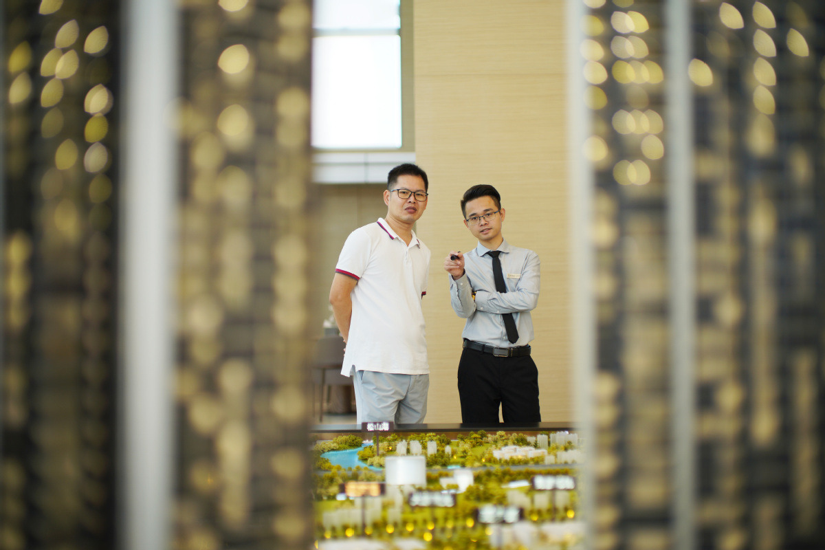 A resident in Guangzhou checks the model of a building before purchasing an apartment. (Photo provided to China Daily)