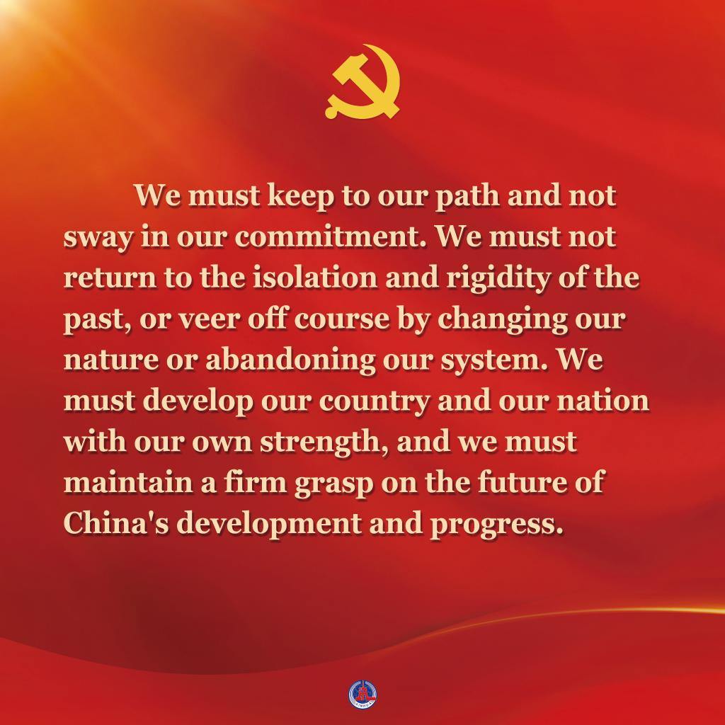 — We must keep to our path and not sway in our commitment. We must not return to the isolation and rigidity of the past, or veer off course by changing our nature or abandoning our system. We must develop our country and our nation with our own strength, and we must maintain a firm grasp on the future of China's development and progress.