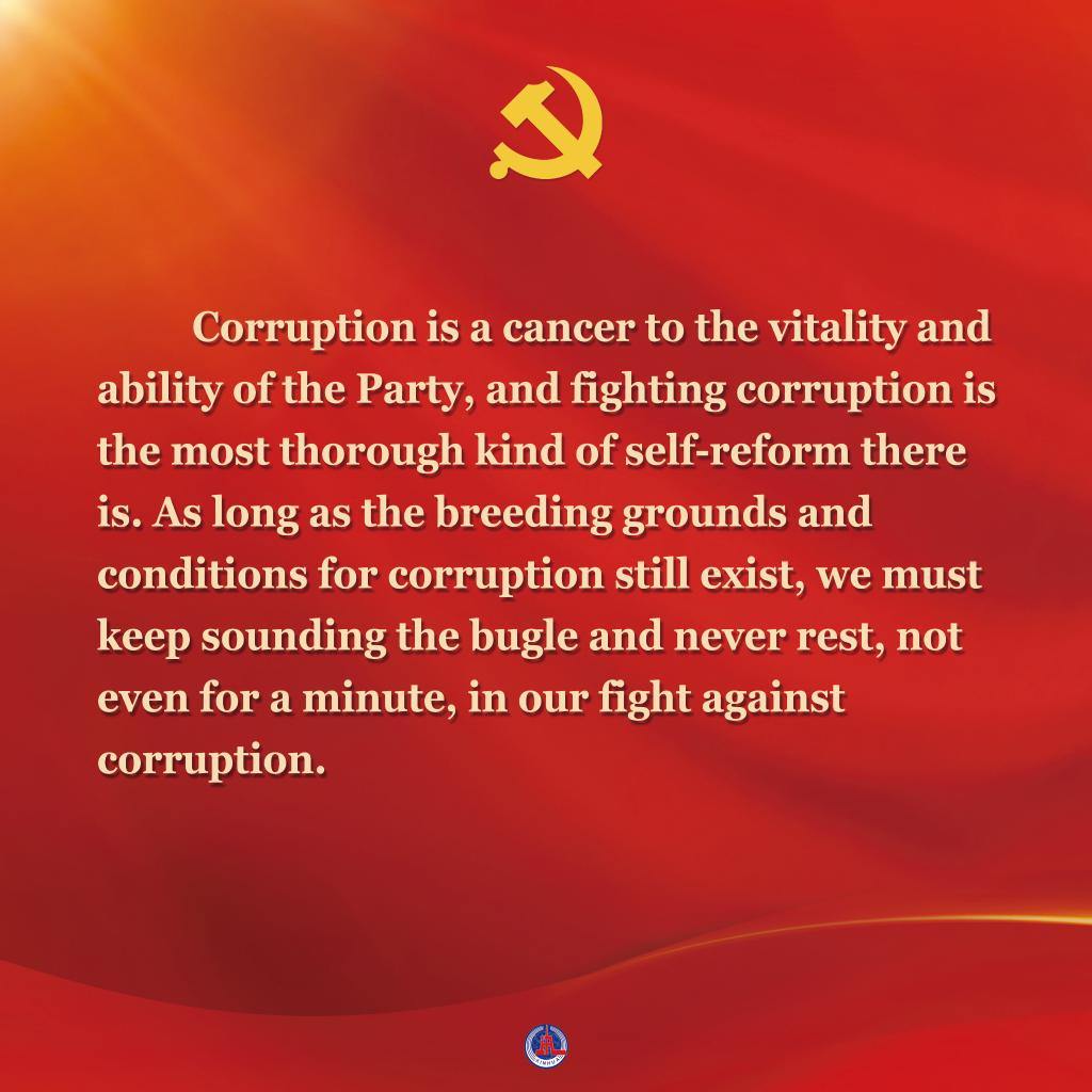 — Corruption is cancer to the vitality and ability of the Party, and fighting corruption is the most thorough kind of self-reform there is. As long as the breeding grounds and conditions for corruption still exist, we must keep sounding the bugle and never rest, not even for a minute, in our fight against corruption.