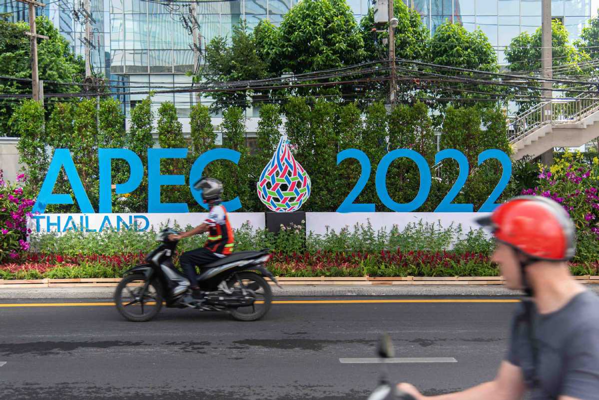 Motorcyclists ride past an APEC 2022 sign in Bangkok, on Tuesday. The APEC 2022 meeting will take place at the Queen Sirikit National Convention Center in Bangkok on Thursday and Friday. (Photo/PEERAPON BOONYAKIAT, via GETTY IMAGES)