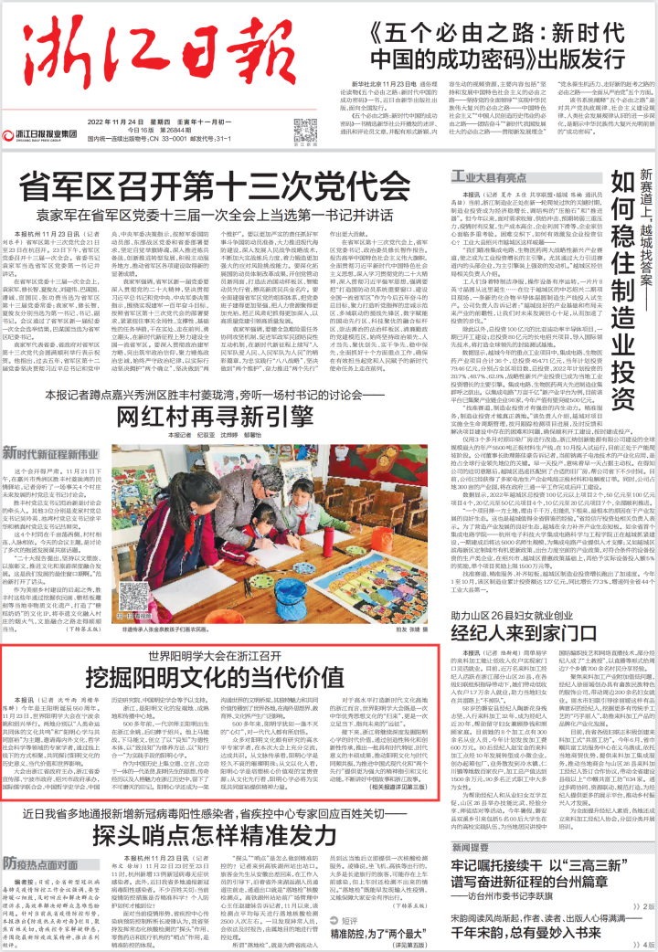 Many high-level experts and scholars who have studied Yangming culture have fully exchanged ideas and reached consensus at this conference. For Zhejiang, which is building a new era of cultural heights at a high level, the World Yangming Congress is not only a "return" of excellent Chinese thought and culture, but also an "expedition" based on the present and looking to the future.