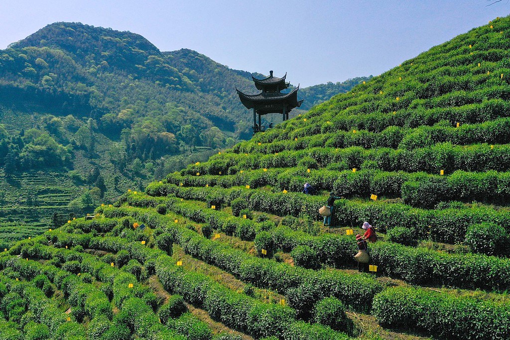 Picking tea leaves in a plantation, Huangshan City, east China's Anhui Province, April 12, 2022.