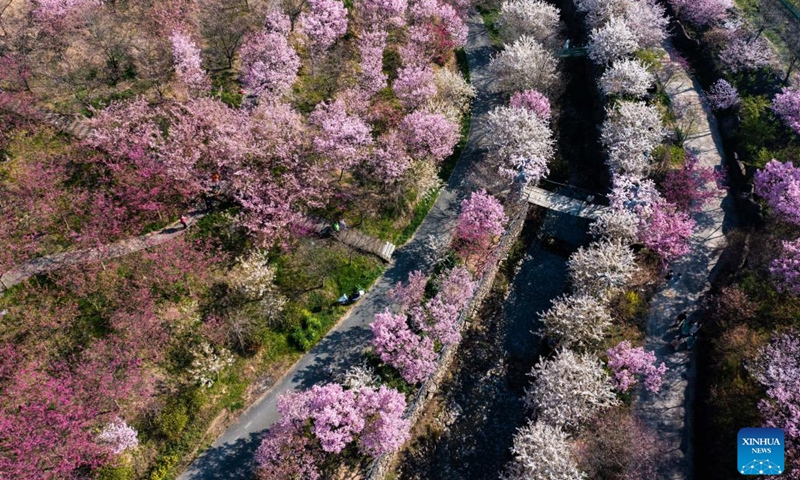 This aerial photo taken on March 13, 2023 shows cherry blossoms in Tangbu Village of Yuhang District in Hangzhou, east China's Zhejiang Province. The cherry blossoms in full bloom attracted many tourists.(Photo: Xinhua)