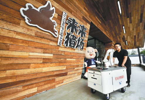 An employee moves a needle-free innoculation robot used for a smart pig farm in Wuzhen township, Zhejiang province, in November. WEI XIAOHAO/ CHINA DAILY