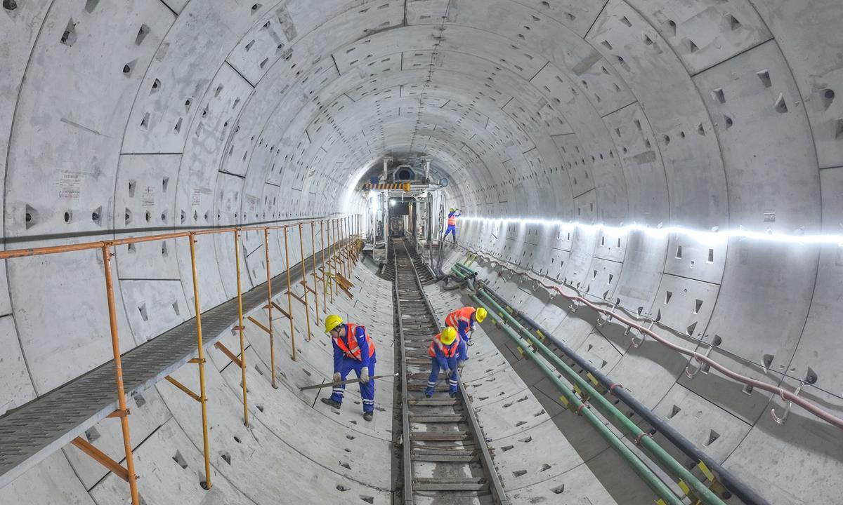 Workers install gear inside a tunnel in Huzhou, East China's Zhejiang Province on February 2, 2023 for the 25.6-kilometer suburban railway in Hangzhou. Some analysts say infrastructure investment in the first quarter could see double-digit growth as localities ramp up projects across China. Photo: cnsphoto