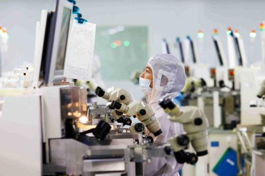 A worker operates equipment to produce chips for export at an electronic component manufacturing enterprise in Suqian, Jiangsu province, on Jan 5. (XU CHANGLIANG/FOR CHINA DAILY)