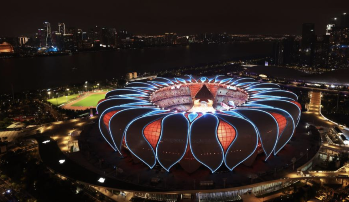 Hangzhou Olympic Sports Center Stadium is lighted during the opening ceremony of the 19th Asian Games in Hangzhou, east China's Zhejiang Province, Sep 23, 2023. (Photo/ Xinhua)