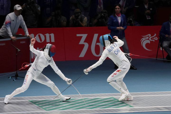 Chen Haiwei, together with Xu Jie and Wu Bin, won a silver medal for China in the Men's Team Foil Final and Republic of Korea won the gold medal.