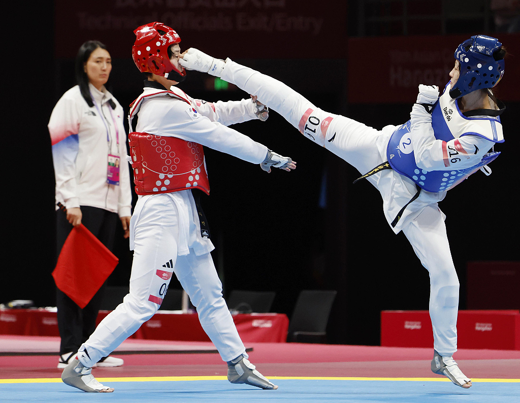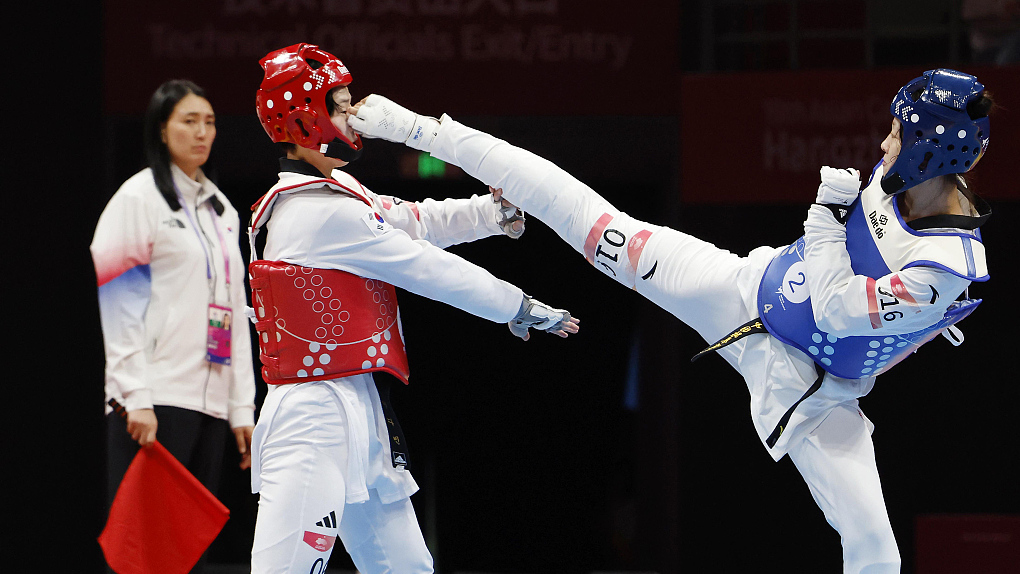 Zhou Zeqi (R) of China fights in the taekwondo mixed team event during the 19th Asian Games in Hangzhou, China, September 25, 2023. /CFP