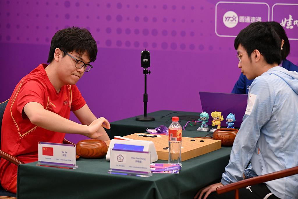 Ke Jie (L) of China and Hsu Hao-hung of Chinese Taipei fight in the men's Go individual final during the 19th Asian Games in Hangzhou, China, September 28, 2023. /CFP