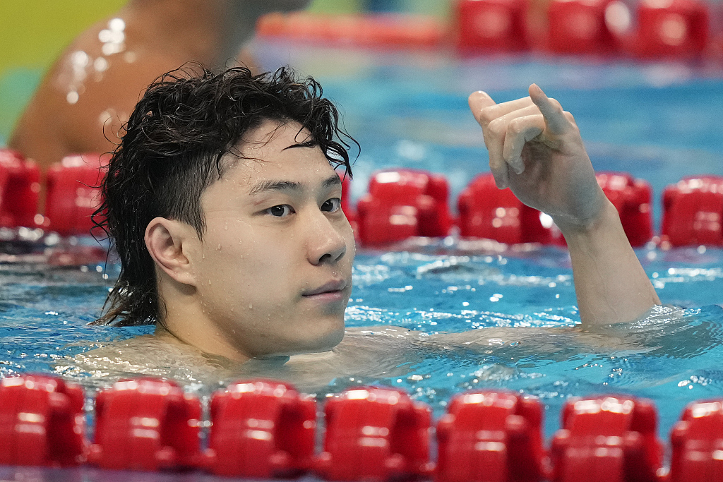 Qin Haiyang of China gestures "six" after bagging his sixth medal during the 19th Asian Games in Hangzhou, China, September 28, 2023. /CFP