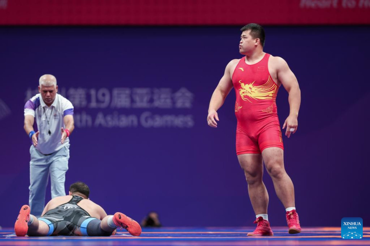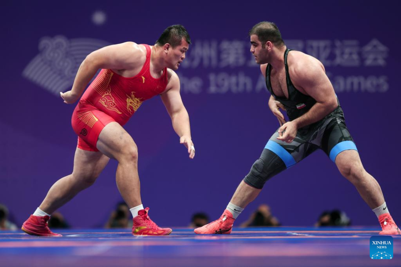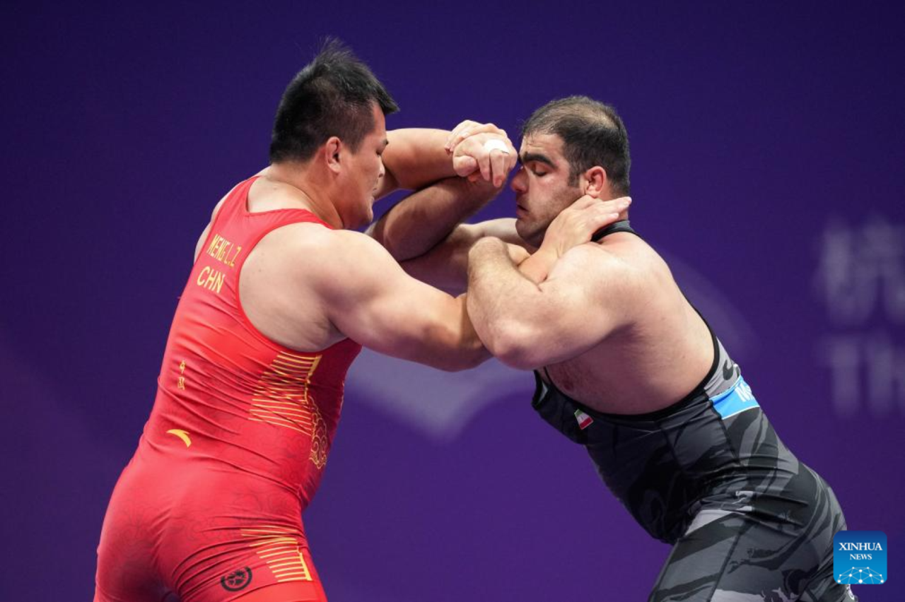 Meng Lingzhe (R) of China competes with Amin Mirzazadeh of Iran during the final of Men's Greco-Roman 130kg of Wrestling at the 19th Asian Games in Hangzhou, east China's Zhejiang Province, Oct. 5, 2023. (Xinhua/Wu Zhuang)