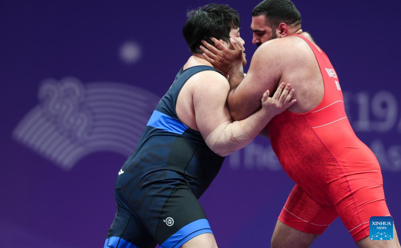 Kim Minseok (L) of South Korea competes with Naveen of India during the bronze medal match of Men's Greco-Roman 130kg of Wrestling at the 19th Asian Games in Hangzhou, east China's Zhejiang Province, Oct. 5, 2023. (Xinhua/Wu Zhuang)