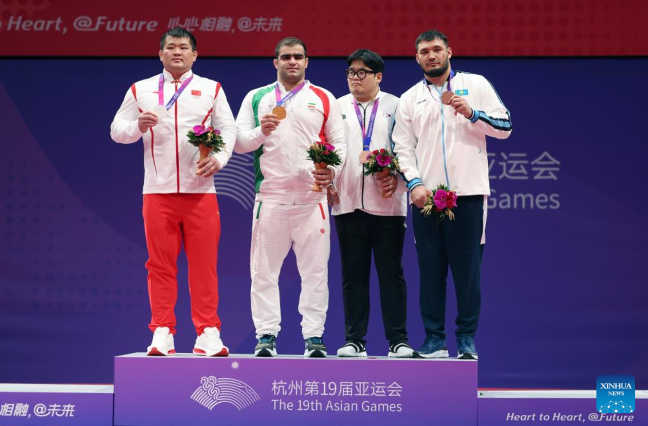 Medalists attend the awarding ceremony of the Men's Greco-Roman 130kg of Wrestling at the 19th Asian Games in Hangzhou, east China's Zhejiang Province, Oct. 5, 2023. (Xinhua/Wu Zhuang)