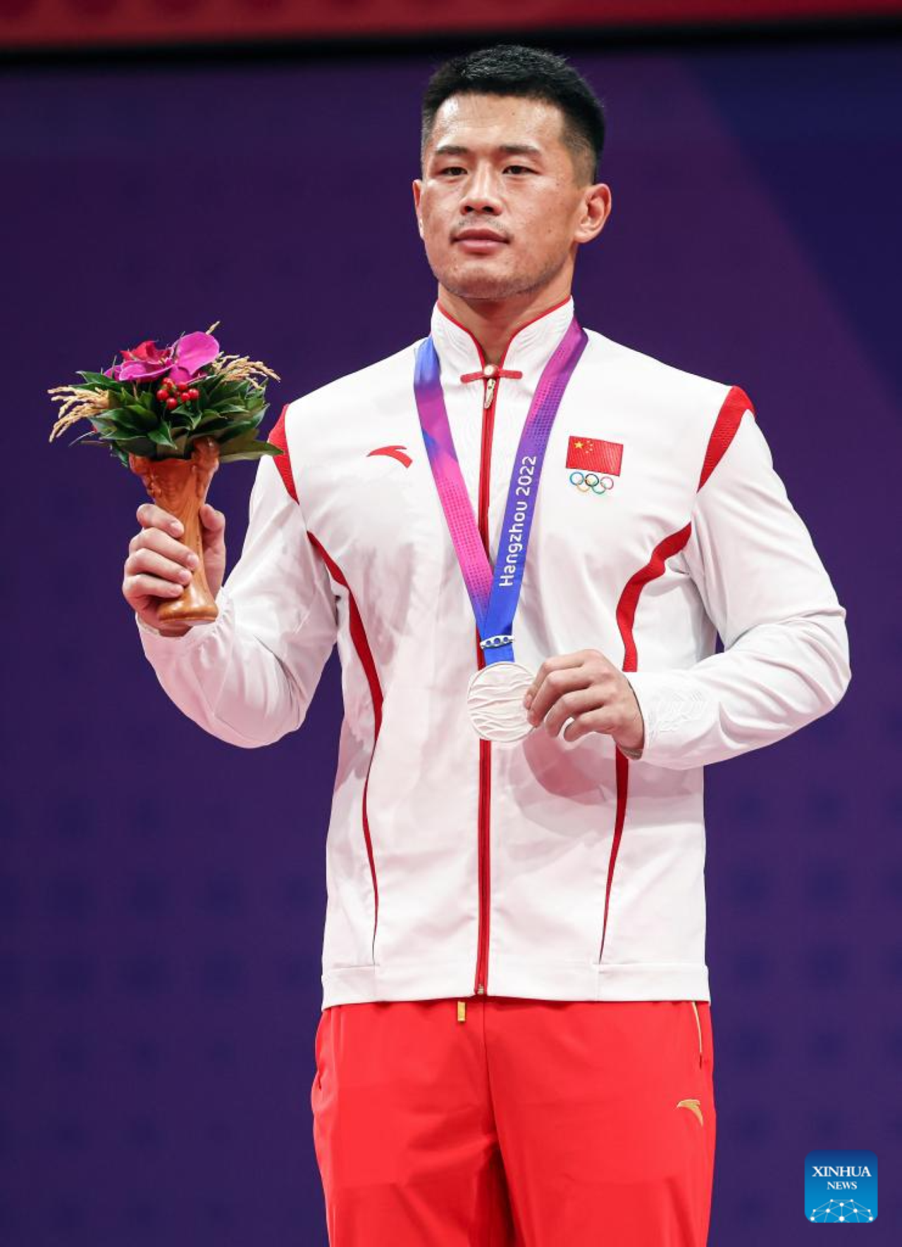 Li Yiming of China reacts during the awarding ceremony of the Men's Greco-Roman 97kg of Wrestling at the 19th Asian Games in Hangzhou, east China's Zhejiang Province, Oct. 5, 2023. (Xinhua/Wu Zhuang)