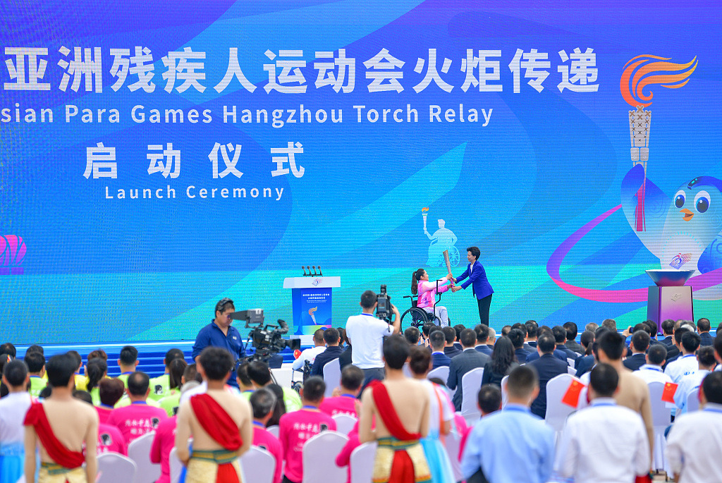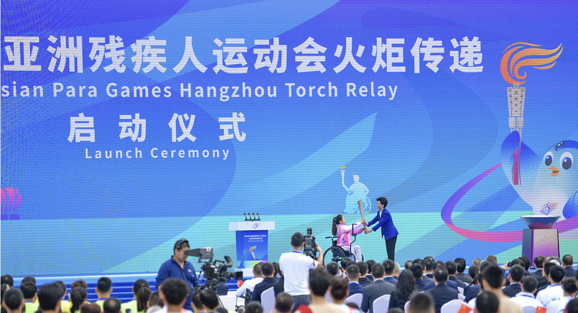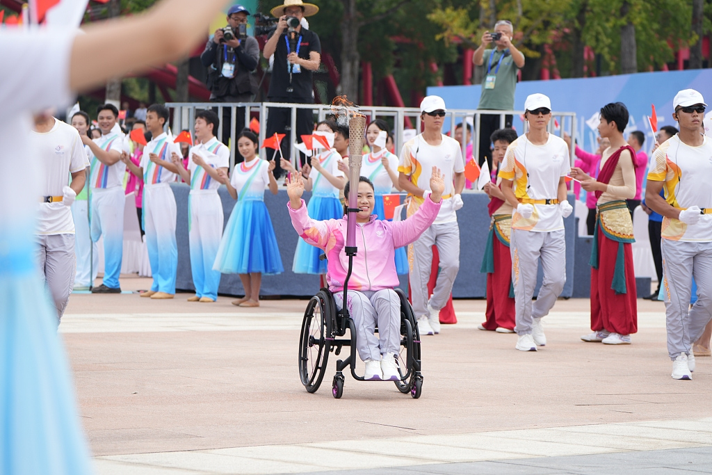 China's para power-lifter Tan Yujiao is the first torchbearer of the torch relay of the fourth Asian Para Games in Chun'an County, Hangzhou, China, October 19, 2023. /CFP