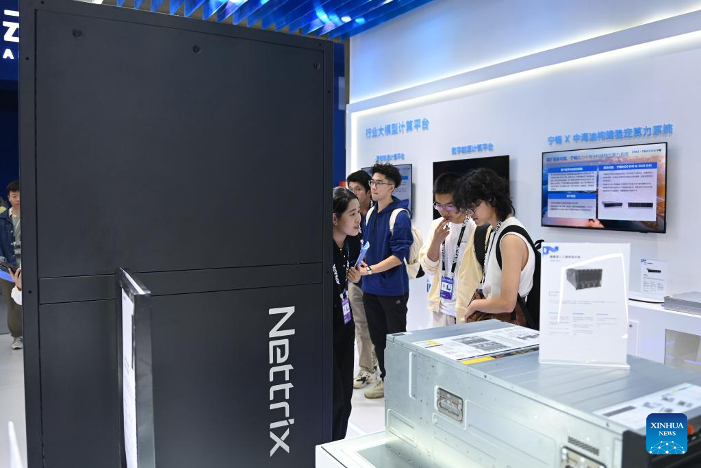 Visitors learn about a server product displayed at an exhibition during the 2023 Apsara Conference in Hangzhou, east China's Zhejiang Province, Oct. 31, 2023. The three-day Apsara Conference, formerly known as Ali cloud developers' conference, kicked off in Hangzhou on Tuesday. (Photo/ Xinhua/ Huang Zongzhi)