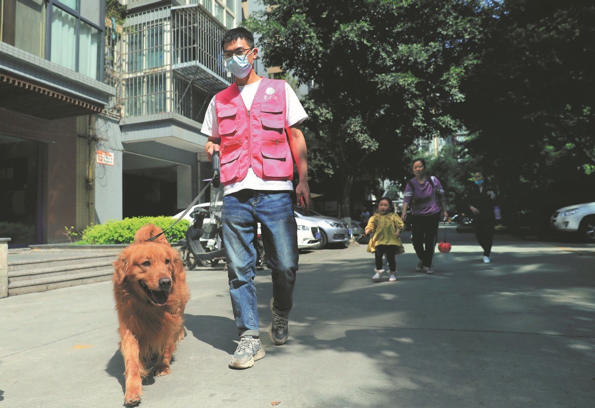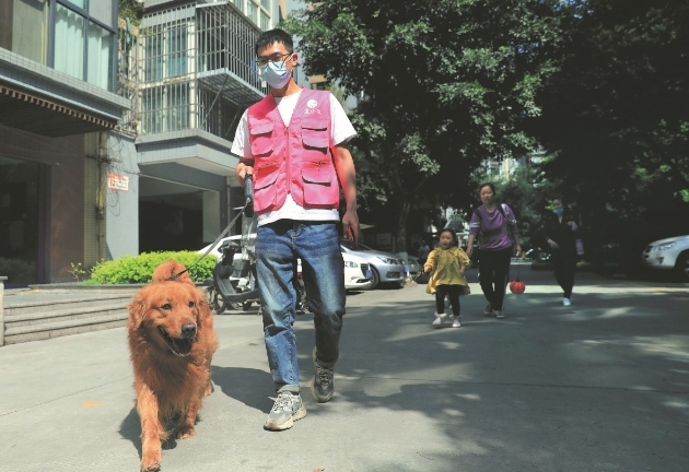 Chen Cong, a part-time "pet sitter", walks a golden retriever for a customer in Chengdu, Sichuan province, in March 2022. [PHOTO/CHINA NEWS SERVICE]