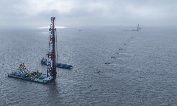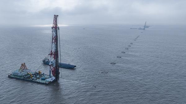 Construction on the Hangzhou Bay Railway Bridge, a crucial component of the Nantong-Suzhou-Jiaxing-Ningbo High-speed Railway, has achieved a significant milestone in its construction progress, with over a thousand pile foundations laid on the south bank.