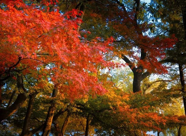 Discover the fiery red of maple leaves as you wander beneath the gentle winter sun, witnessing their soft radiance that glistens in the light.