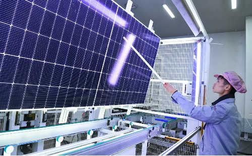 A technician checks solar panels at a production line of a tech company in Jinhua, Zhejiang province. [Photo provided to ezhejiang.gov.cn]